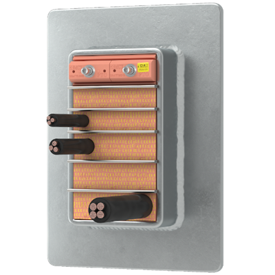 The system consists of a frame, rubber blocks and a compression unit. The frame is casted or bolted to a structure and packed with rubber blocks suited for each cable and pipe dimension. The compression unit is inserted to compress the rubber blocks against cables and pipes to establish a tight seal.