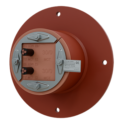 The system consists of a round rubber frame (RGP Ex) and rubber blocks. The RGP Ex system must be installed with a MCT Brattberg sleeve as a kit, and packed with rubber blocks suited for each cable and pipe dimension. The compression bolts are tightened to compress the rubber blocks against cables and pipes to establish a tight seal.