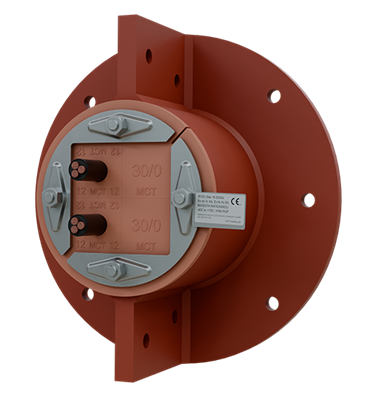 The system consists of a round rubber frame (RGP Ex) and rubber blocks. The RGP Ex system must be installed with a MCT Brattberg sleeve as a kit, and packed with rubber blocks suited for each cable and pipe dimension. The compression bolts are tightened to compress the rubber blocks against cables and pipes to establish a tight seal.